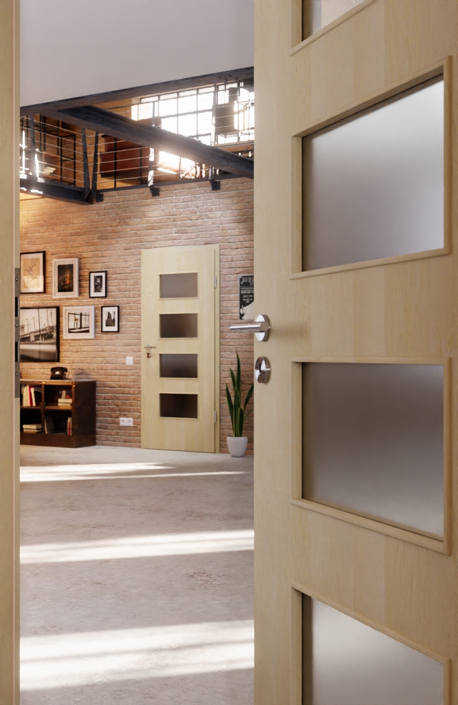 Cechą szczególną drzwi jest przeszklenie, które zapewnia wrażenie otwartego wnętrza. W zakresie szkła istnieje możliwość wyboru między klasycznymi rozwiązaniami, takimi jak szkło przezroczyste, a nowoczesnymi wariantami szkła. Wewnątrz znajduje się ramiak z twardego drewna, który zapewnia niezbędną stabilność.