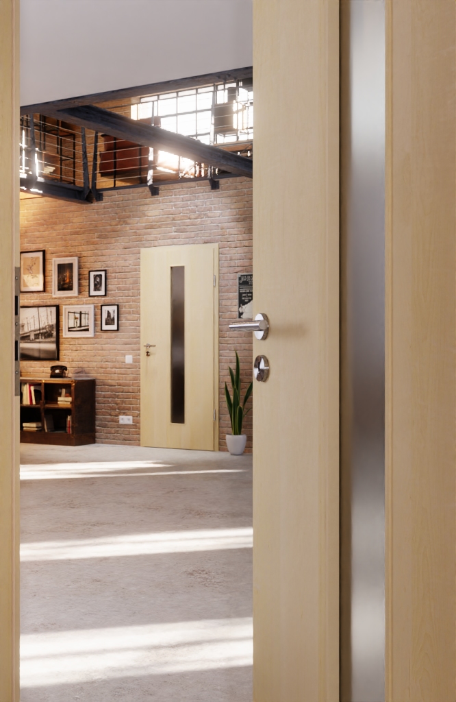 Harmonia drewnianych drzwi i wycięcia na szybę: Gładkie drzwi wewnętrzne Optima firmy Jeld-Wen, fornirowane drewnem naturalnym w kolorze klonu kanadyjskiego Classic łączą naturalny design z solidnym wykonaniem i przeszkleniem.