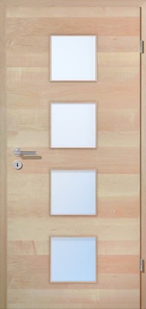 Stabilne drzwi drewniane z wycięciem na szybę; wytrzymała okleina z forniru w kolorze klonu kanadyjskiego Drzwi wewnętrzne Optima firmy Jeld-Wen z otworem świetlnym charakteryzują się naturalnym wyglądem.