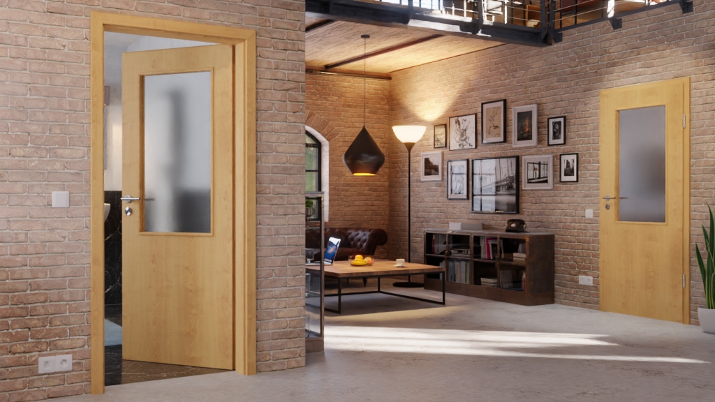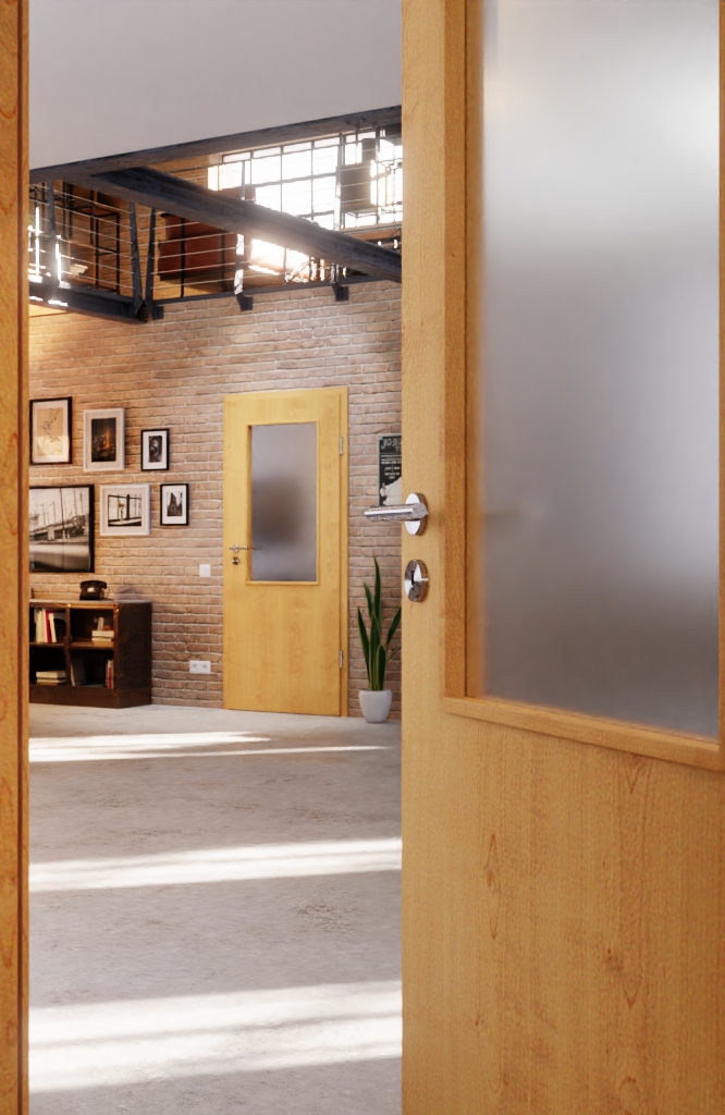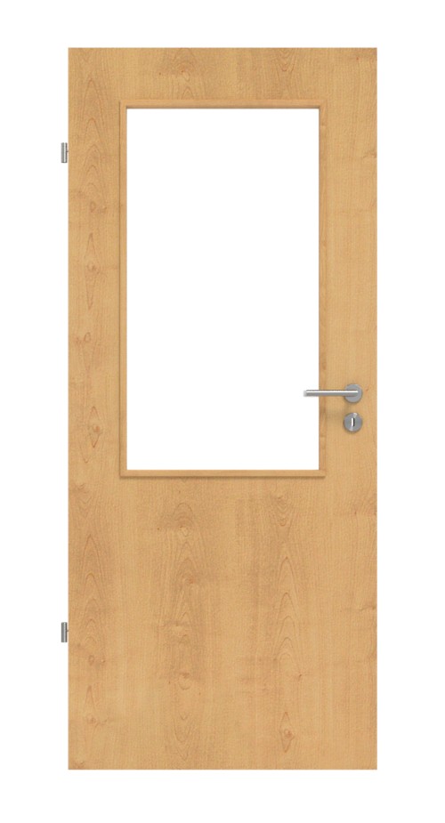 Prostokątowe okno szklane wizualnie dzieli drzwi na dwie części. Dolna połowa drzwi jest chroniona przed uszkodzeniami szkła dzięki wyższej pozycji, górna umożliwia wgląd do wnętrza.