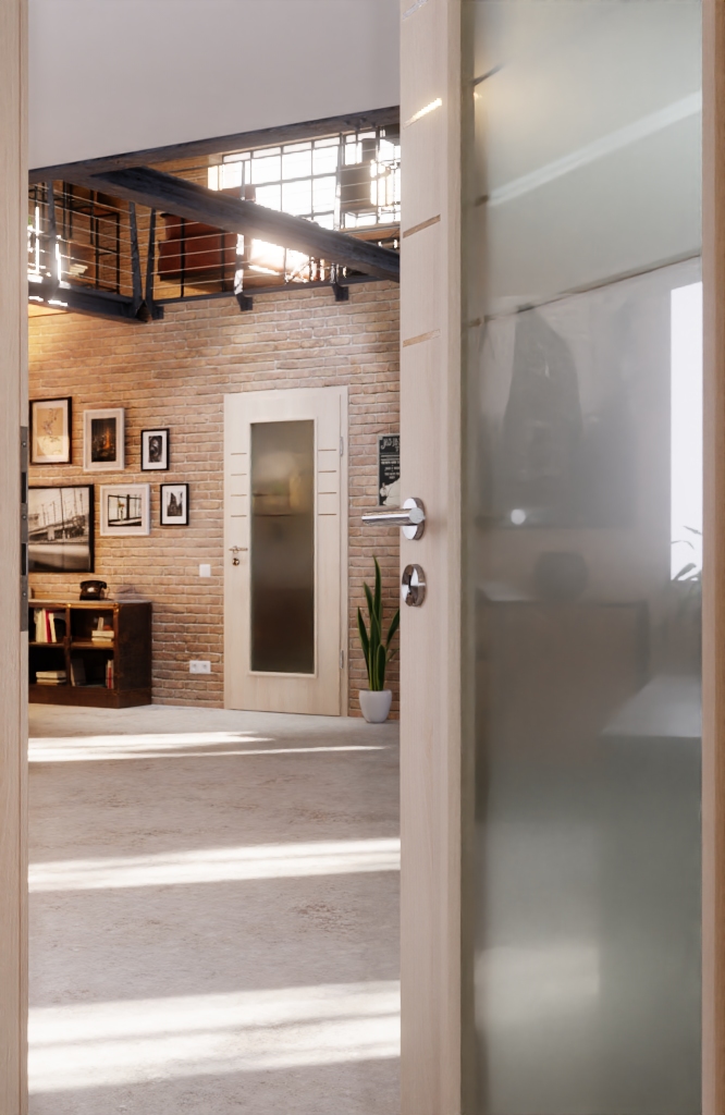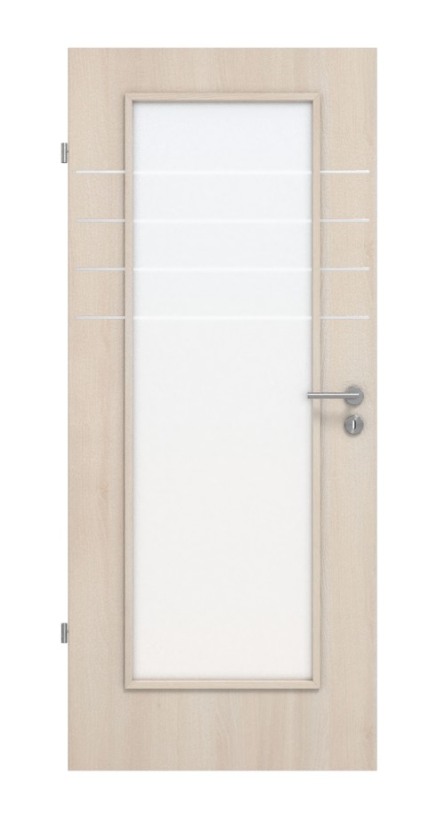 Jasna powierzchnia z dekorem w kolorze akacjowym i duże przeszklenie nadają pomieszczeniuwyjątkowo przyjazny charakter. W przypadku zastosowanego szkła ESG można wybrać wersję przezroczystą lub satynowaną. Ponadto w górnej części skrzydła drzwiowego znajdują się cztery pasy wzdłużne.