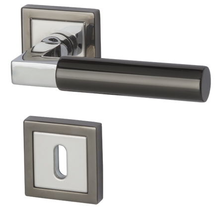 Elegancko polerowane powierzchnie chromowe kwadratowych rosetek harmonizują przyjemnie z czarną, polerowaną klamką. Zintegrowana sprężyna powrotna zawsze przywraca klamkę do poziomu.