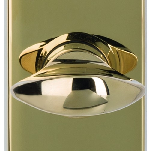Prostokątna płyta w złotym wykończeniu jest widocznie przykręcona. Uchwyt ma kanciastą krzywiznę, a następnie przechodzi w prostą cylindryczną formę.