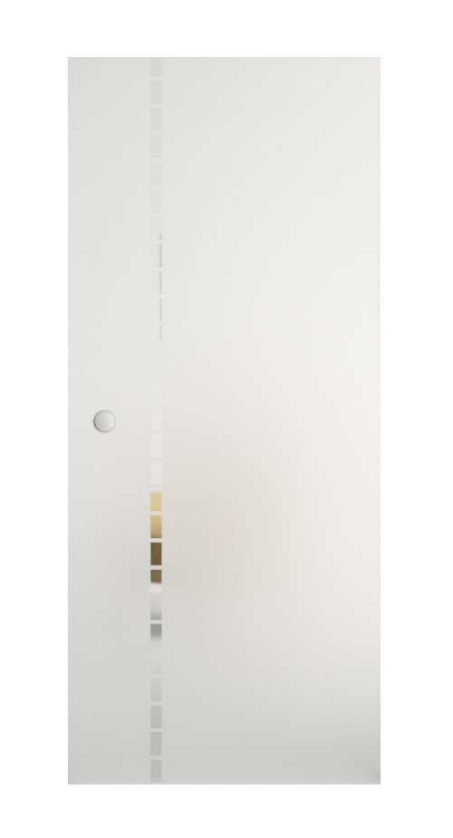 Po stronie zamka na satynowanym skrzydle drzwiowym znajduje się wąski motyw belki ze szkła przezroczystego. Z jednej strony satynowanie zapewnia domownikom prywatność, z drugiej – motyw nadaje eleganckie wykończenie wizualne i wypełnia pomieszczenie jasnością. Dzięki stonowanemu designowi i wysokiej jakości wykonaniu te drzwi przesuwne będą ozdobą Twojego mieszkania.