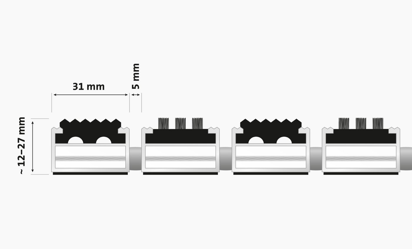 Dzięki żłobionym profilom gumowym w połączeniu z szczotką kasetową masz do dyspozycji doskonały zespół. Obszary zewnętrzne bez zadaszenia nie stanowią problemu dla mat wejściowych. Wysoka odporność na zużycie i niewrażliwość sprawiają, że maty są wszechstronne. Dzięki sztywnym profilom możesz bez problemu poruszać się po matach na wózku inwalidzkim lub wózku dziecięcym. Możesz wybierać spośród różnych wysokości.