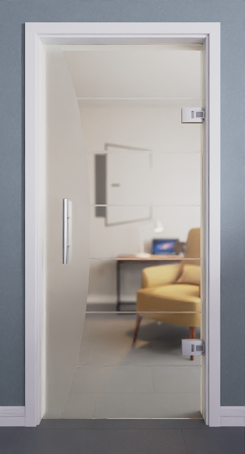 Drzwi wahadłowe Amara przekonują swoim nowoczesnym wyglądem. Matowe, półokrągłe wycięcie podkreśla uchwyt drążkowy drzwi wahadłowych. Symetryczne linie przebiegające po powierzchni transparentnego szkła nadają drzwiom elegancki wygląd.
