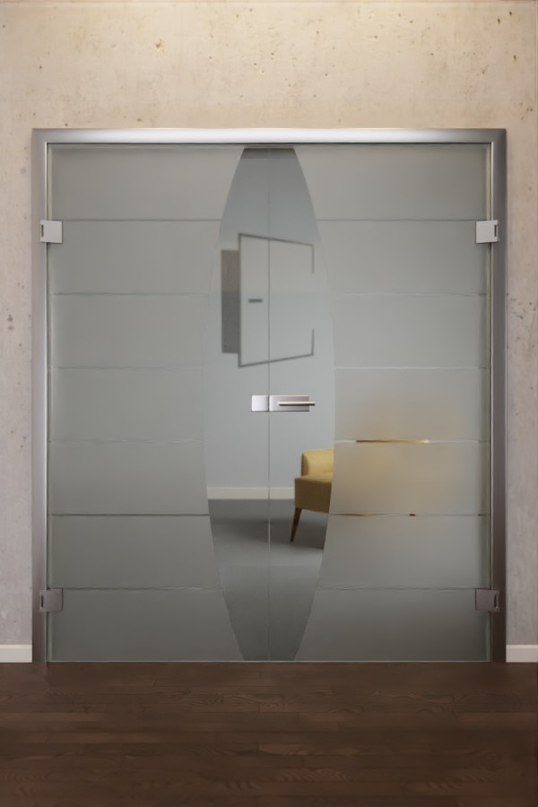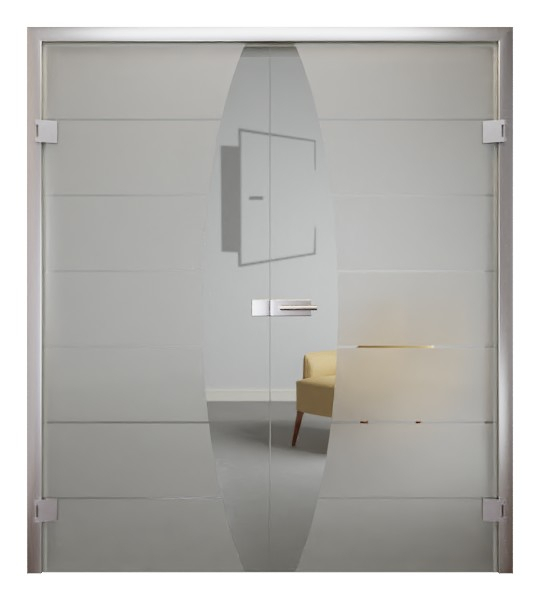Motyw nadaje tym całkowicie przeszklonym drzwiom dwuskrzydłowym imponujący wygląd. Półokrągłe wycięcie ze szkła przezroczystego po stronie klamki drzwiowej połączono z filigranowymi, przezroczystymi liniami poprzecznymi. Dzielą one skrzydło bierne i czynne na 7 prostokątów, nadając drzwiom charakterystyczny design. Ponadto motyw ten, dzięki przezroczystym wstawkom szklanym, zapewnia przejrzystość i jasność oraz umożliwia harmonijne przenikanie światła do pomieszczenia.