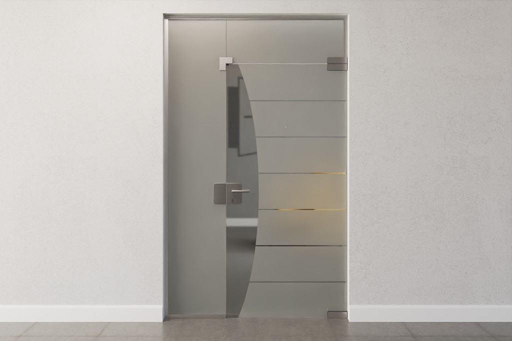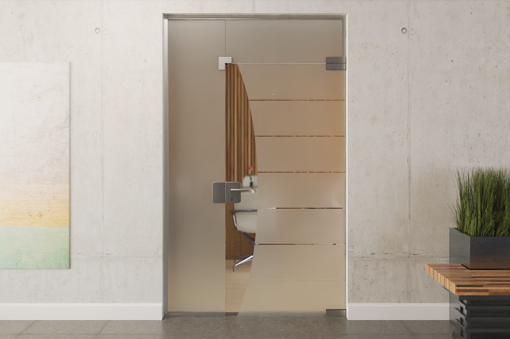 Nowoczesne drzwi szklane z bocznym panelem i świetlikiem, w tym okucia DORMA Mundus: