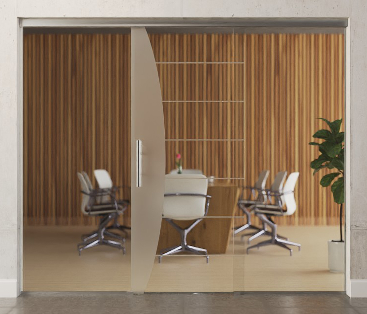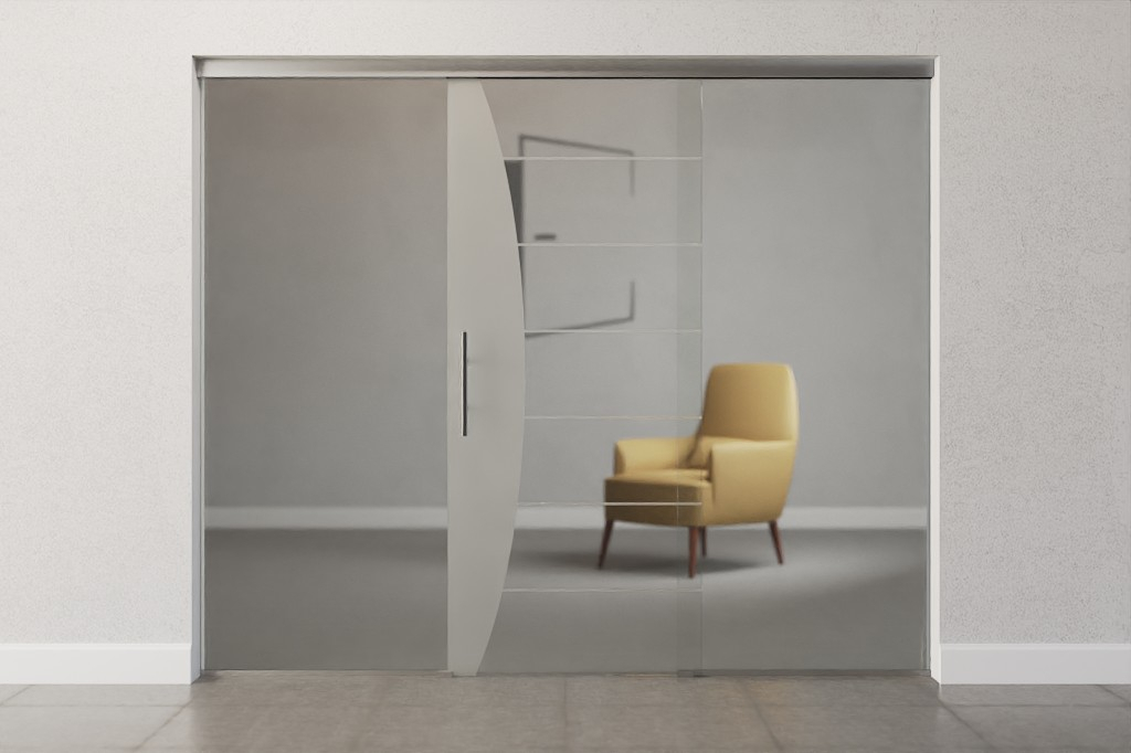 Całkowita szerokość zabudowy całoszklanej rozkłada się równomiernie na skrzydło drzwiowe i elementy boczne, dzięki czemu powstaje symetryczne wykończenie wizualne.