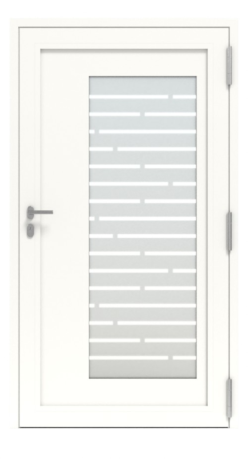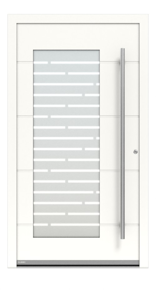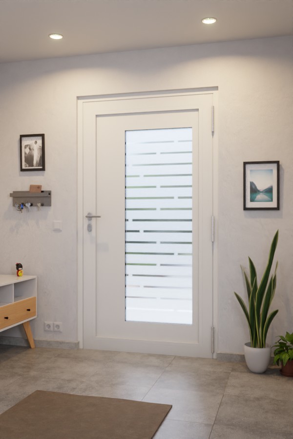 Cztery poziome rowki charakteryzują to skrzydło drzwiowe. Zintegrowany prostokątny element szklany zapewnia dużą ilość światła w strefie wejścia do domu. Design z drobno piaskowanego szkła z przesuniętymi, przerywanymi paskami szkła przezroczystego przepuszcza światło dzienne, ale nie pozwala na niepożądane spojrzenia.