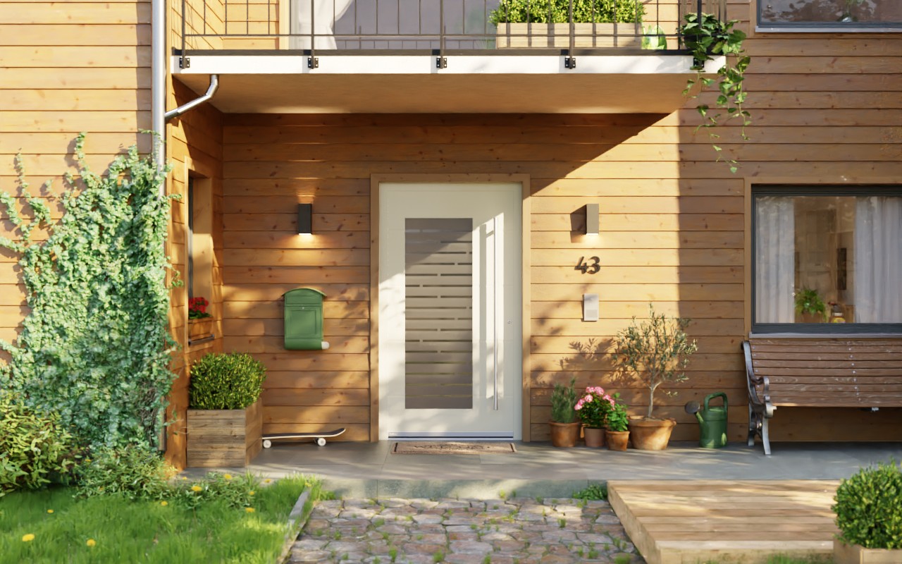 Potrójne szklenie izolacyjne z uszczelkami pomiędzy nimi stanowi standard zapewniający zwiększoną efektywność energetyczną. Poziomy uszczelnień w systemie profili zapewniają doskonałą ochronę przed wiatrem i deszczem. Automatyczna mechaniczna blokada bezpieczeństwa autoLock AV3 z tylnym zaczepem i 3-częściowe aluminiowe zawiasy rolkowe dopełniają to standardowe wyposażenie drzwi wysokiej jakości .