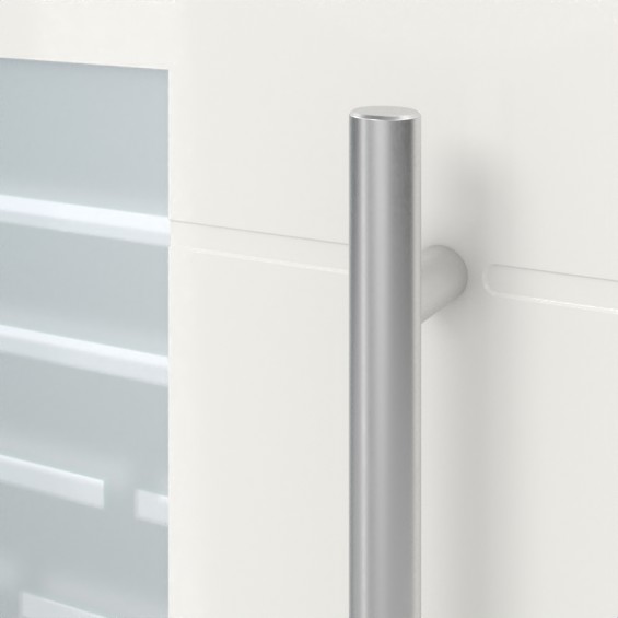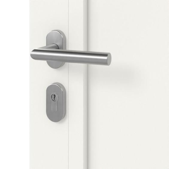 Model dopełnia elegancki uchwyt drążkowy ze stali szlachetnej matowej szczotkowanej oraz estetyczna rozeta ze stali szlachetnej, która ukrywa wkładkę profilową z zabezpieczeniem przed manipulacją .