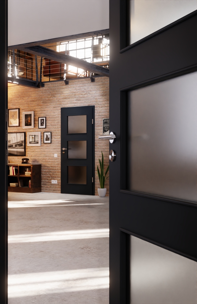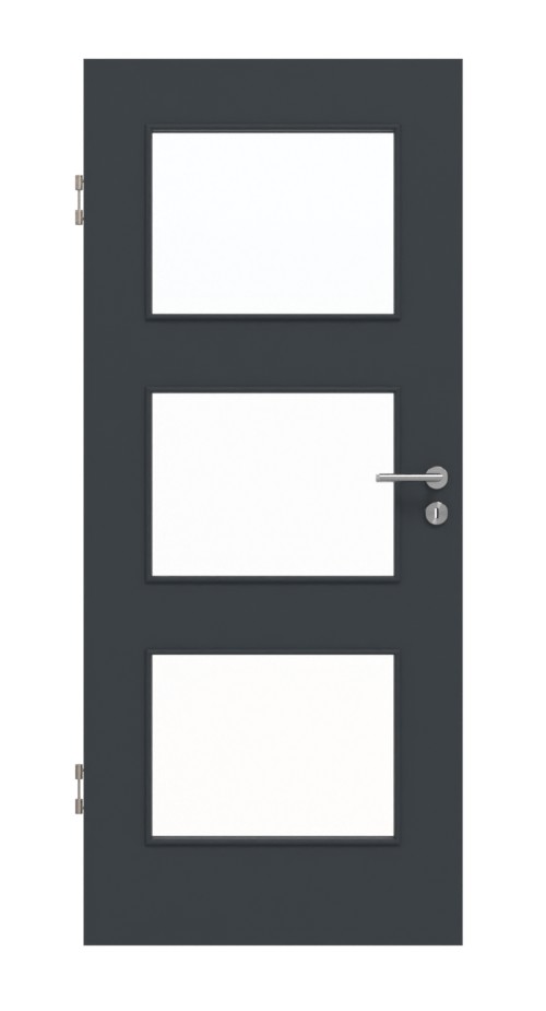 W skrzydle drzwi znajdują się trzy duże przeszklenia. Wysokiej jakości lakier w kolorze antracytowym zapewnia doskonały blask.