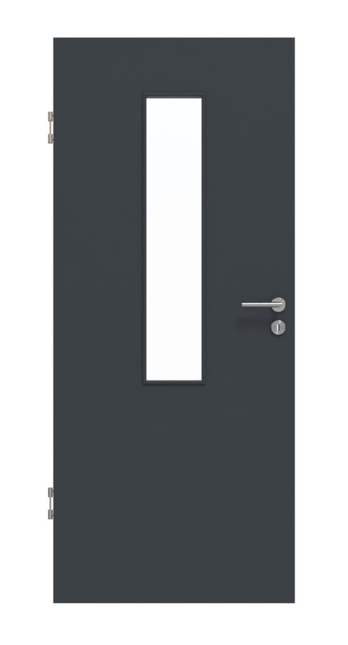 W górnej części skrzydła drzwi znajduje się wąski przeszklenie. Szary kolor sprawia, że model ten pasuje do każdego wnętrza.