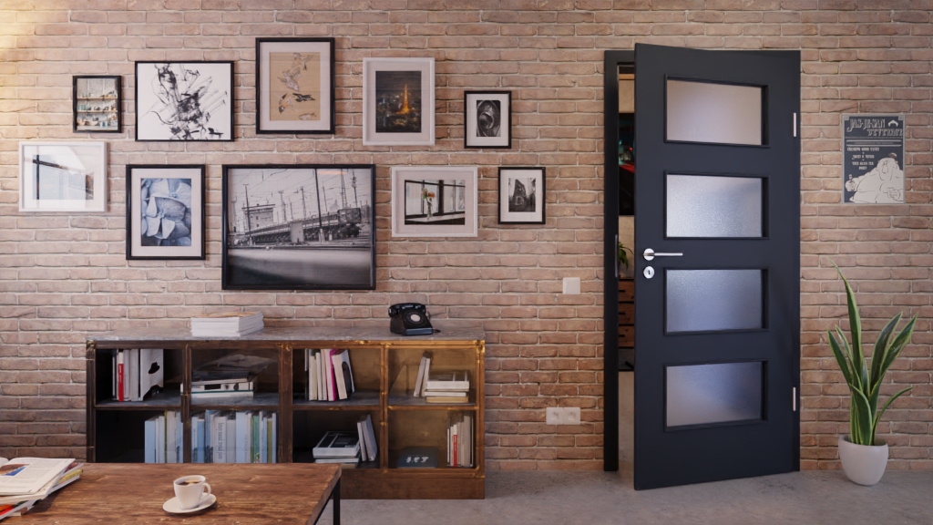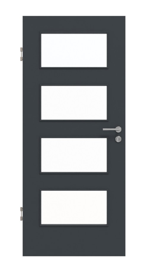 Cztery prostokątne przeszklenia są umieszczone w równych odstępach w skrzydle drzwi. Dzięki wysokiej jakości lakierowi w kolorze antracytowym możesz cieszyć się estetycznym wyglądem.