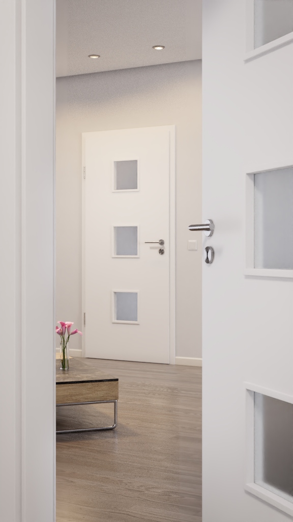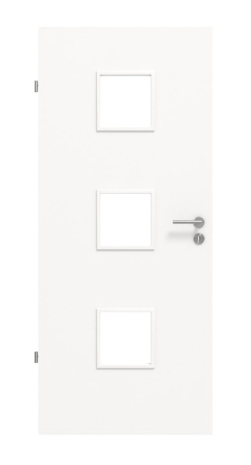 Otwór świetlny z nałożonymi listwami w kształcie prostokąta nadaje pomieszczeniu nowoczesny charakter. Trzy kwadratowe otwory świetlne w środku drzwi zachwycają wszechstronnością. Ich rozmieszczenie umożliwia trzy efekty: widok na zewnątrz, wystarczającą ilość światła oraz chroniony dolny obszar drzwi przed uszkodzeniami.