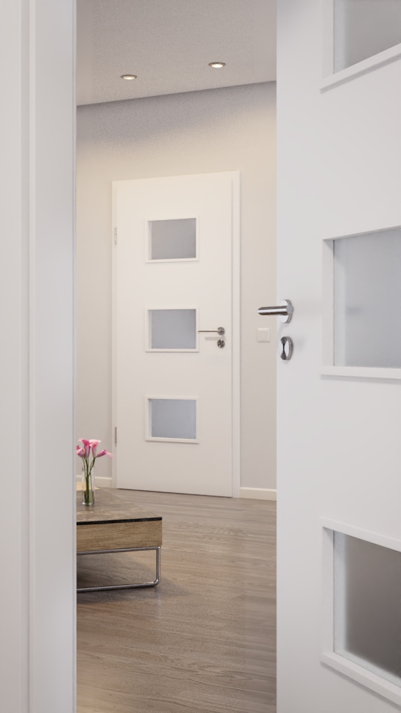 Prostokątny design z nałożonymi listwami szklanymi wprowadza nowoczesny klimat. W przypadku szklanych wersji od przezroczystego do matowego masz odpowiedni widok do swojego wnętrza.