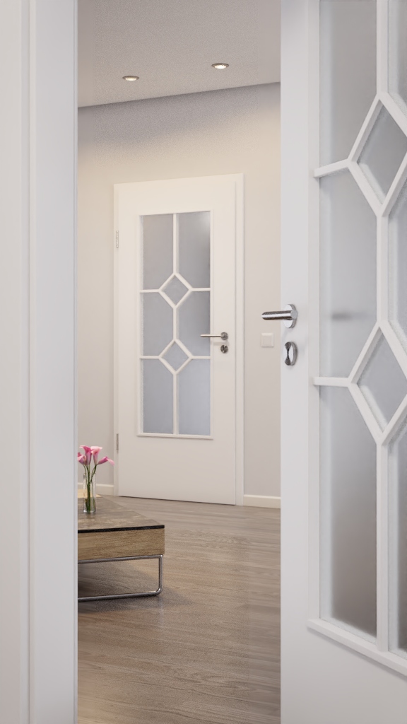 Otwór świetlny z nałożonymi listwami w kształcie prostokąta nadaje pomieszczeniu nowoczesny charakter. Dzięki lekkiemu przesunięciu w górę zapewniona jest dodatkowa ochrona przed stłuczeniem szkła. Nałożone listwy nadają jej stylowy wygląd. Dzięki układowi listew powstaje interesujący wzór z sześcioma otworami szklanymi, które są połączone dwoma romboidalnymi wycięciami. Wybór szkła od przezroczystego do matowego spełnia nowoczesne wymagania w szczegółach. Listwy szklane i listwy są w kolorze drzwi.