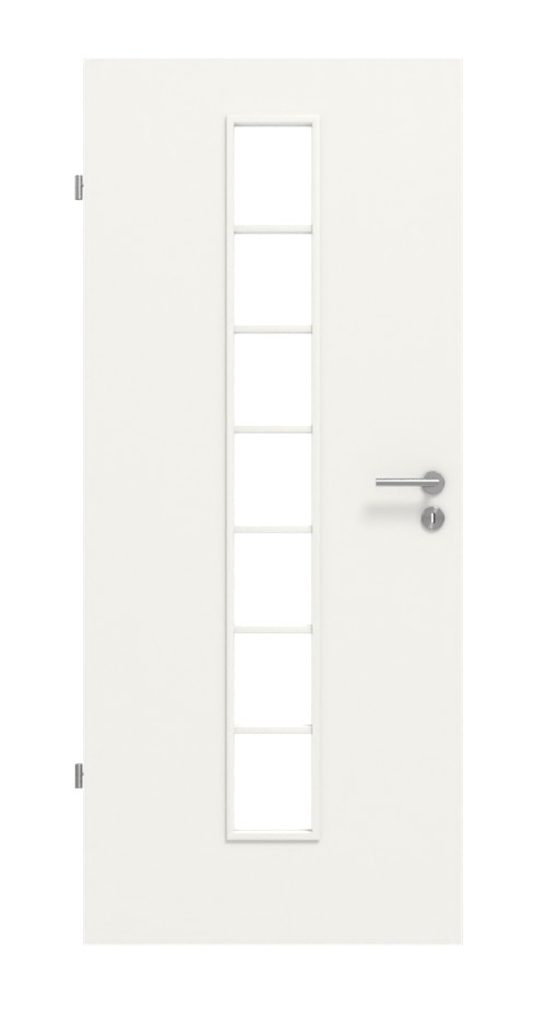 Otwór świetlny znajduje się w środku skrzydła drzwi. Wydłużony otwór umożliwia widok na całą wysokość drzwi. Nałożone listwy nadają atrakcyjny wygląd - dodatkowo to designowe przeszklenie podkreślają szkła przezroczyste i piaskowane. Siedem kwadratów oddzielonych listwami tworzy interesującą atmosferę. Kolor powierzchni drzwi powtarza się w listwach i listwach. W standardowej konfiguracji skrzydło drzwiowe jest bez wkładu szklanego. Wypełnienie szklane jest dostępne za dodatkową opłatą.