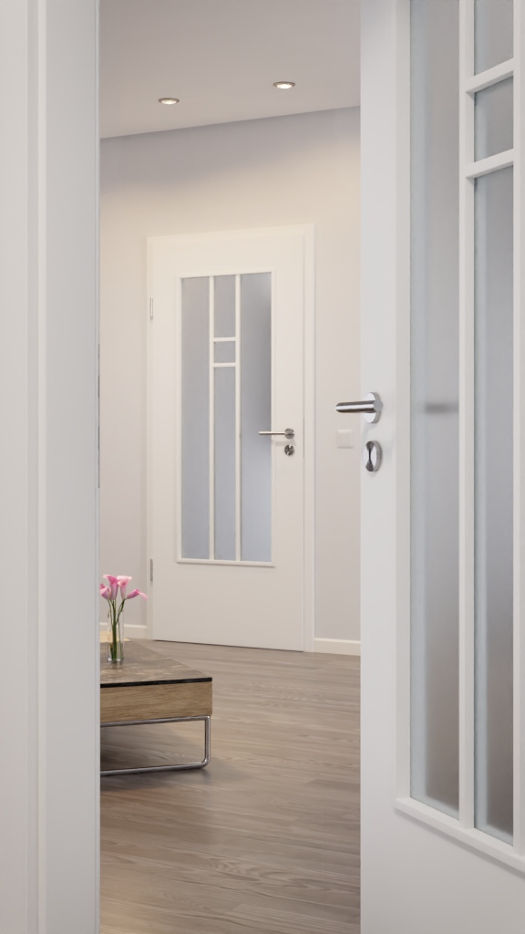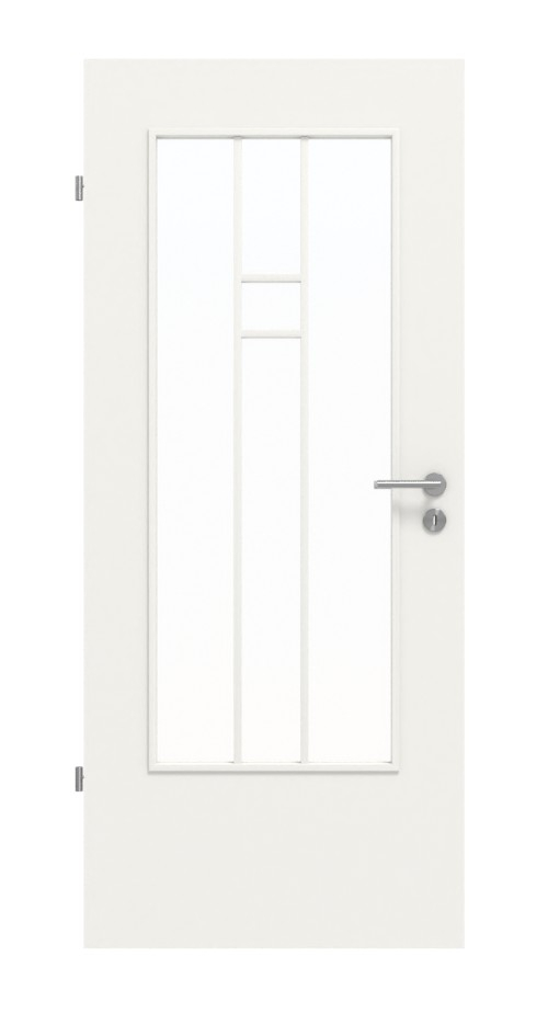 Biała powłoka zapewnia bezproblemowe zastosowanie drzwi w wielu pomieszczeniach. Dzięki designowi przeszklenia można umiejętnie podkreślić akcenty!