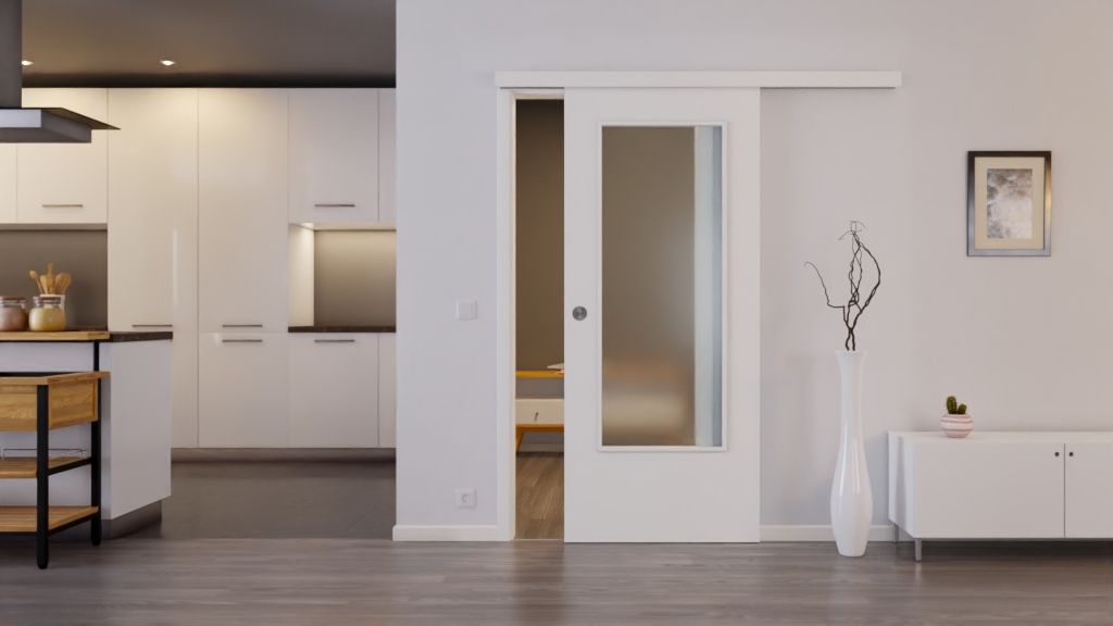 Duża szklana powierzchnia znajduje się w środku drzwi i wpuszcza dużo światła do pomieszczenia.