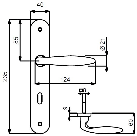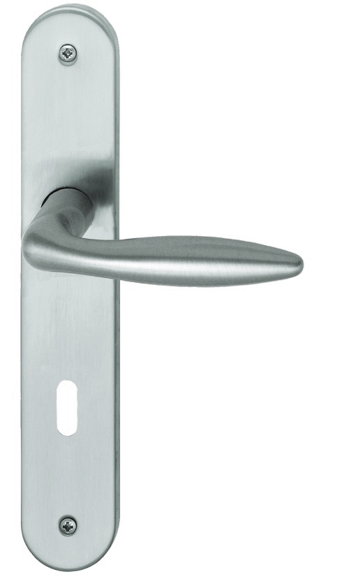 Model składa się z widocznie przykręconej długiej tarczy, cygarokształtnej klamki oraz okrągłego gałki na zewnętrzną stronę drzwi wejściowych.