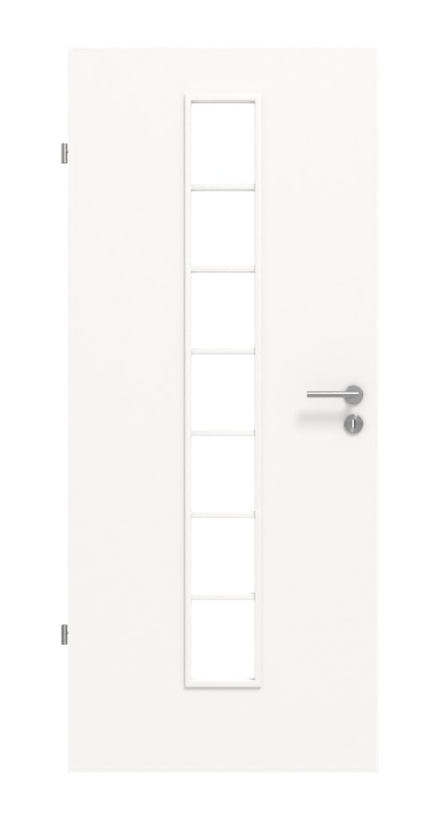 Prostokątny przeszklenie z nałożonymi listwami szklanymi zapewnia nowoczesną atmosferę. Charakteryzuje się centralnym umiejscowieniem. Wydłużone otwarcie umożliwia widok na całą wysokość drzwi. Nałożone listwy nadają atrakcyjny wygląd. Dodatkowo, szkło dekoracyjne podkreślone jest zastosowaniem szkła piaskowanego i przezroczystego. Siedem kwadratów oddzielonych listwami tworzy interesującą atmosferę. Kolorystyka drzwi znajduje odzwierciedlenie w listwach szklanych i listwach.