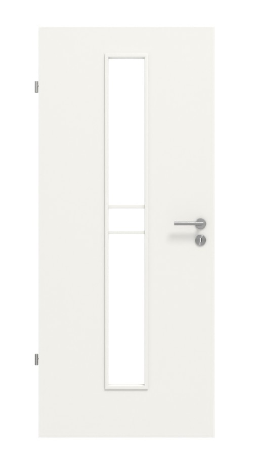 Środkowa pozycja przeszklenia umożliwia symetryczną równowagę w Twoim pomieszczeniu. Widok na całą wysokość drzwi zapewnia wydłużone otwarcie. Nowoczesny wygląd osiągnięto dzięki nałożonym listwom. Użycie szkła piaskowanego i szkła przezroczystego jako szklenia dekoracyjnego podkreśla ten efekt. To przeszklenie jest optycznie przerywane przez listwy, tworząc mały prostokąt w środku. Listwy, listwy i drzwi mają tę samą kolorystykę. W standardowej konfiguracji skrzydło drzwiowe jest bez wypełnienia szklanego. Za dodatkową opłatą dostępny jest wkład szklany.