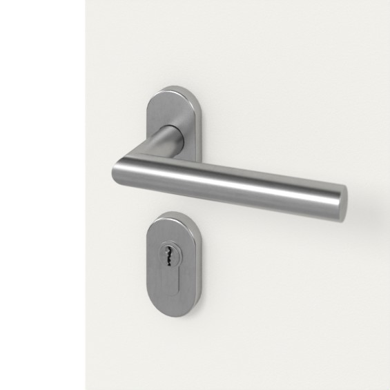 • Zestaw okuć Inox składający się z klamek w kształcie litery L i owalnych rozet