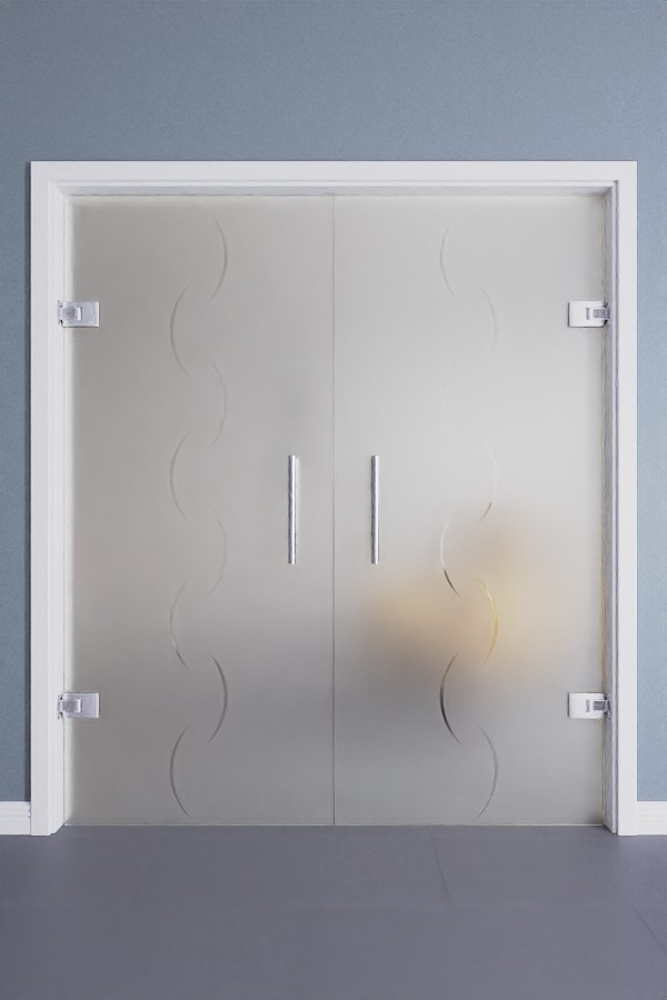 Przezroczyste krzywizny zdobią środek dwóch matowych skrzydeł drzwiowych. Formy są naniesione pionowo i spokojnie wiją się po skrzydłach. Dekor jest lekki i pasuje do każdego otoczenia.
