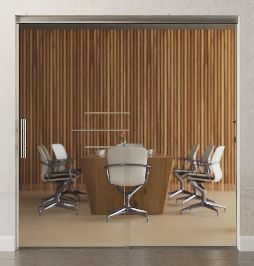 Całkowita szerokość zabudowy szklanej rozkłada się równomiernie na skrzydło drzwiowe i element boczny, dzięki czemu powstaje symetryczne wykończenie wizualne.