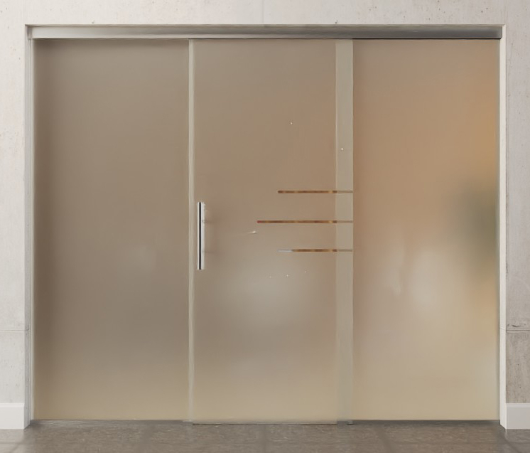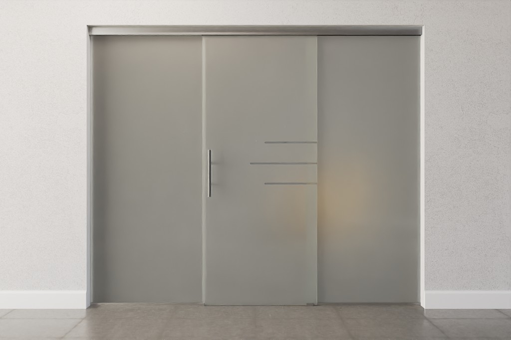 Całkowita szerokość zabudowy całoszklanej rozkłada się równomiernie na skrzydło drzwiowe i elementy boczne, dzięki czemu powstaje symetryczne wykończenie wizualne.
