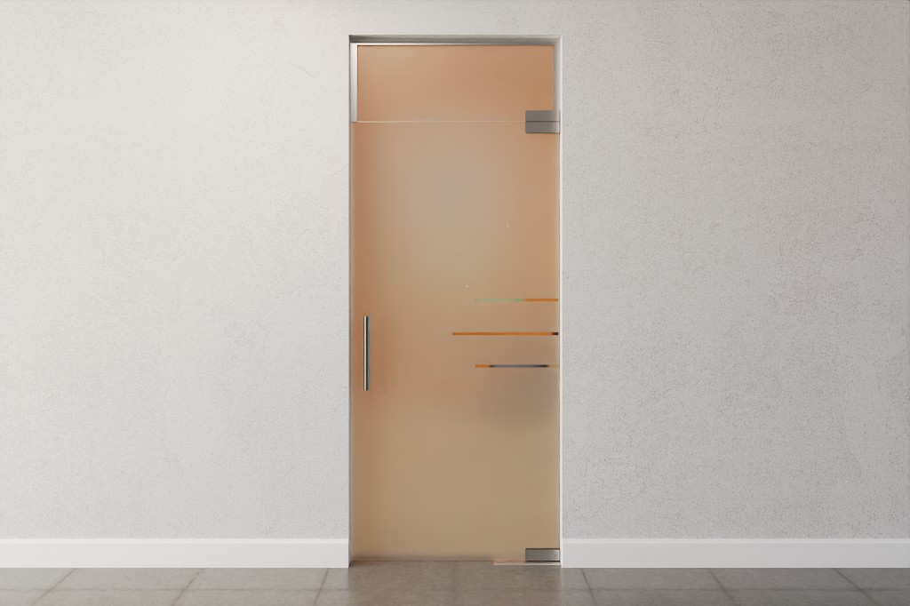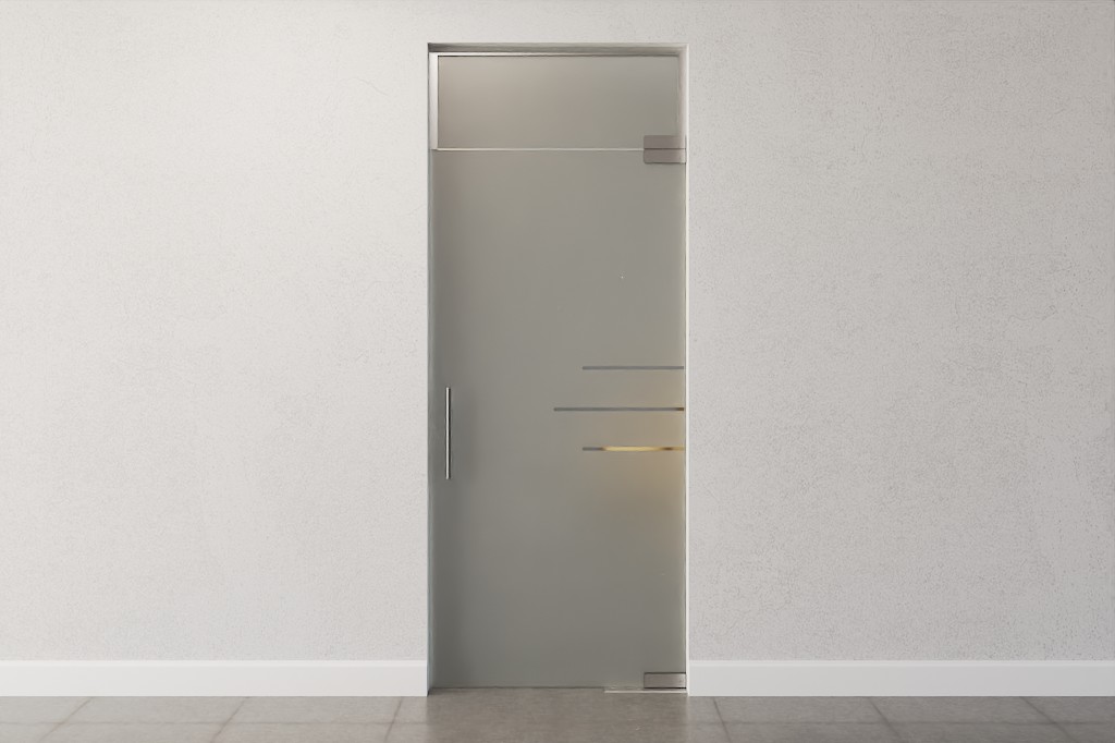 Solidna całoszklana konstrukcja z drzwiami wahadłowymi i świetlikiem, wykonana z wytrzymałego szkła bezpieczeństwa: