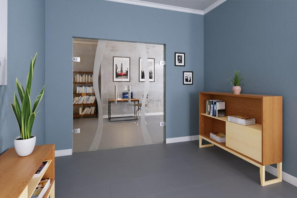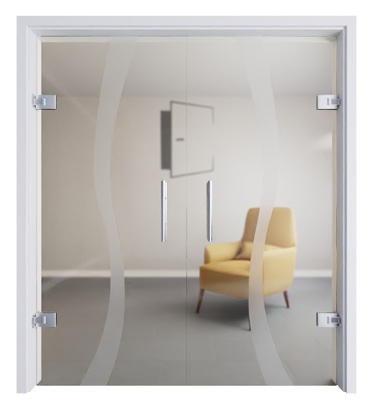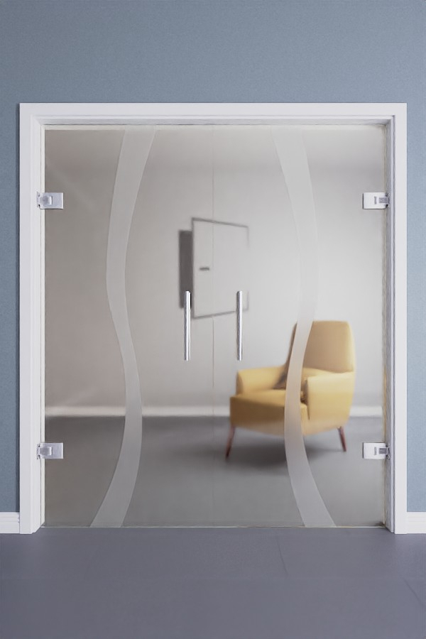 Każda z matowych krzywizn przebiega pionowo poprzez skrzydła drzwi. Dekoracja delikatnie otacza oba uchwyty klamek drzwiowych. Dynamiczny wzór nadaje szklanemu zespołowi lekkości.