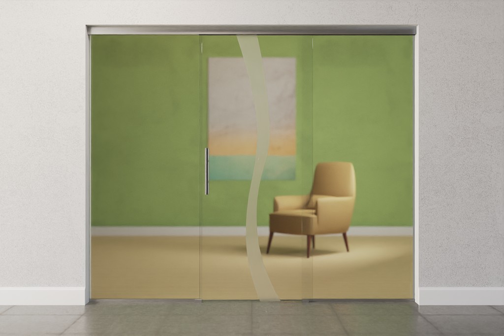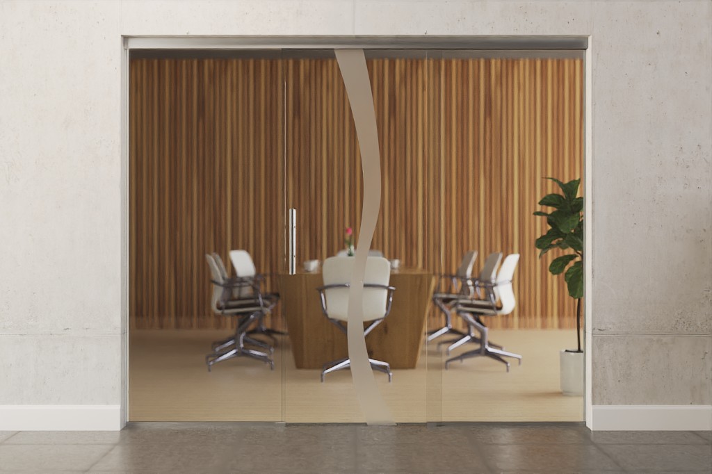 Całkowita szerokość zabudowy całoszklanej rozkłada się równomiernie na skrzydło drzwiowe i elementy boczne, dzięki czemu powstaje symetryczne wykończenie wizualne.