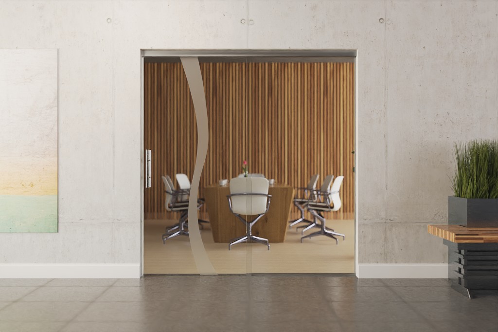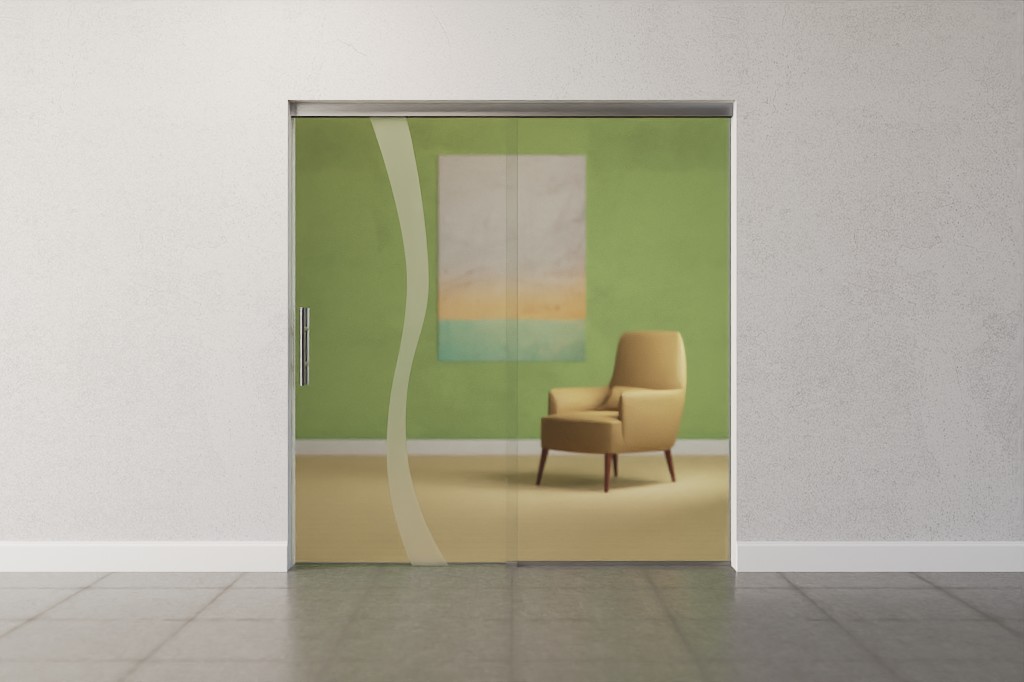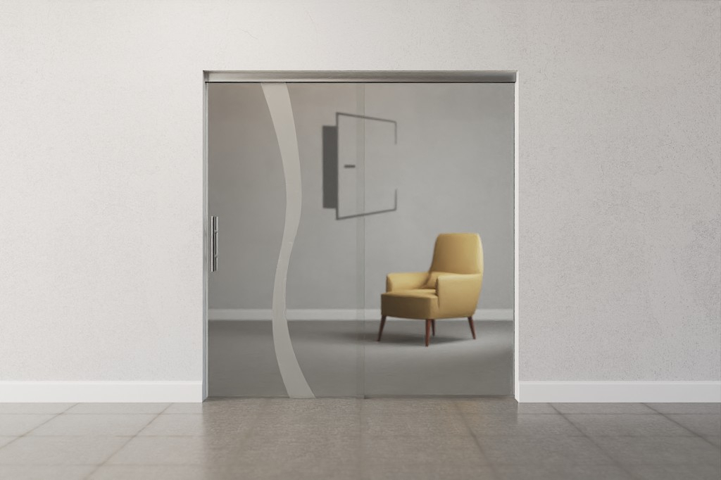 Całkowita szerokość zabudowy szklanej rozkłada się równomiernie na skrzydło drzwiowe i element boczny, dzięki czemu powstaje symetryczne wykończenie wizualne.