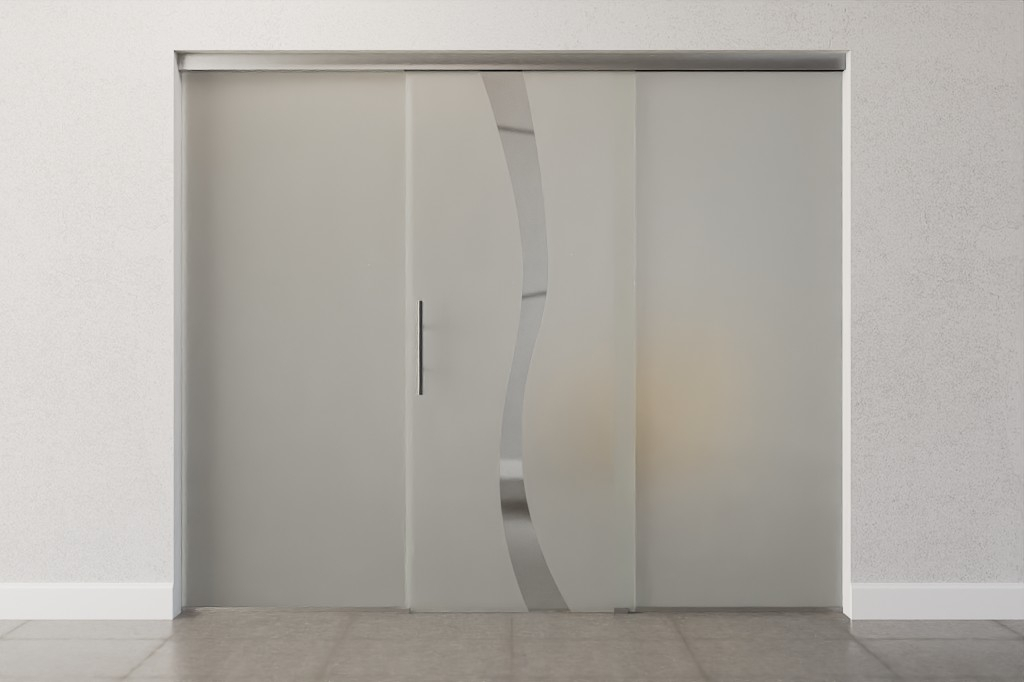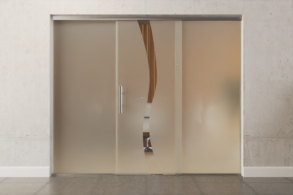 Całkowita szerokość zabudowy całoszklanej rozkłada się równomiernie na skrzydło drzwiowe i elementy boczne, dzięki czemu powstaje symetryczne wykończenie wizualne.