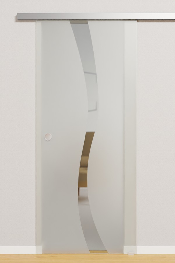 Design satynowanych drzwi przesuwnych charakteryzuje się zakrzywioną linią z szkła przezroczystego. Biegnie ona pośrodku całego skrzydła drzwiowego i nadaje mu dynamiczny wygląd. Matowe skrzydło drzwiowe zapewnia osłonę po lewej i prawej stronie przezroczystej fali, ale nadal wpuszcza do pomieszczenia przyjemne światło. Ponadto wyraźny motyw fal tworzy przyjazną atmosferę w pomieszczeniu i stanowi stylowy akcent w każdym pomieszczeniu mieszkalnym.
