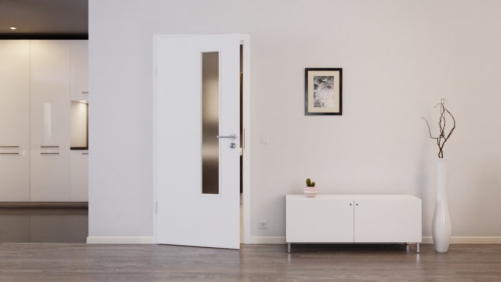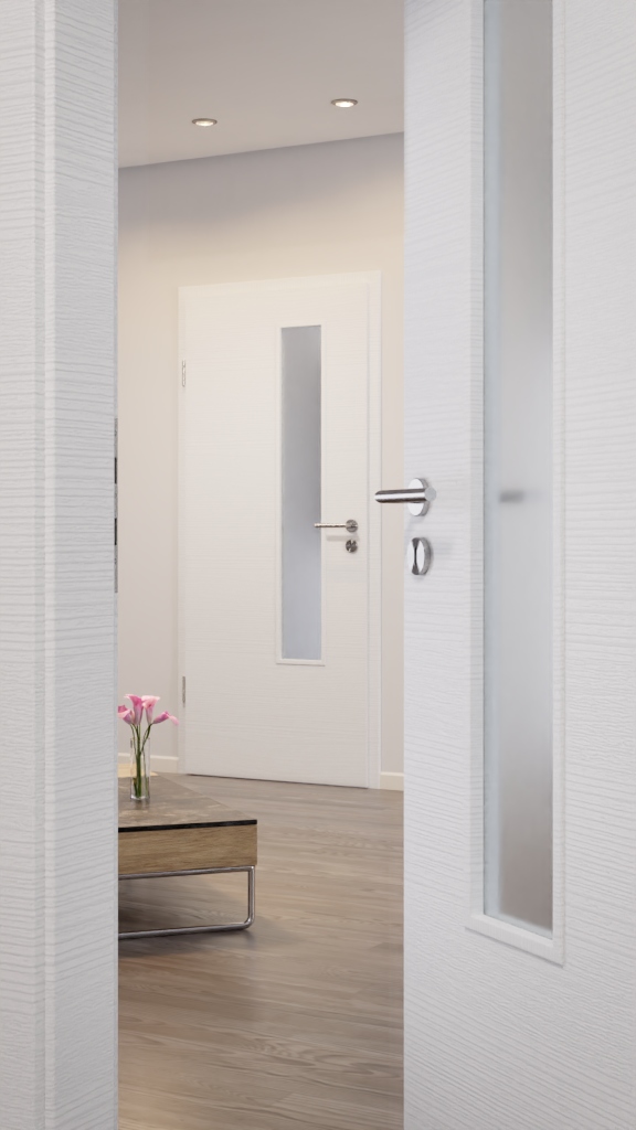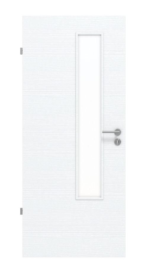 Delikatne podłużne linie nadają białym skrzydłom drzwiowym indywidualny charakter. Wąskie przeszklenie nadaje drzwiom nowoczesny i otwarty wygląd.
