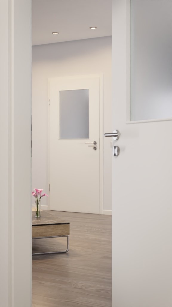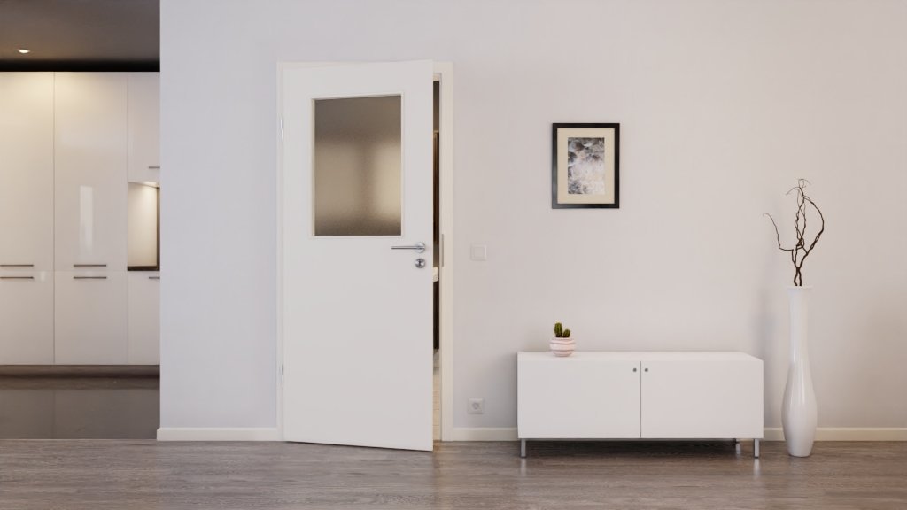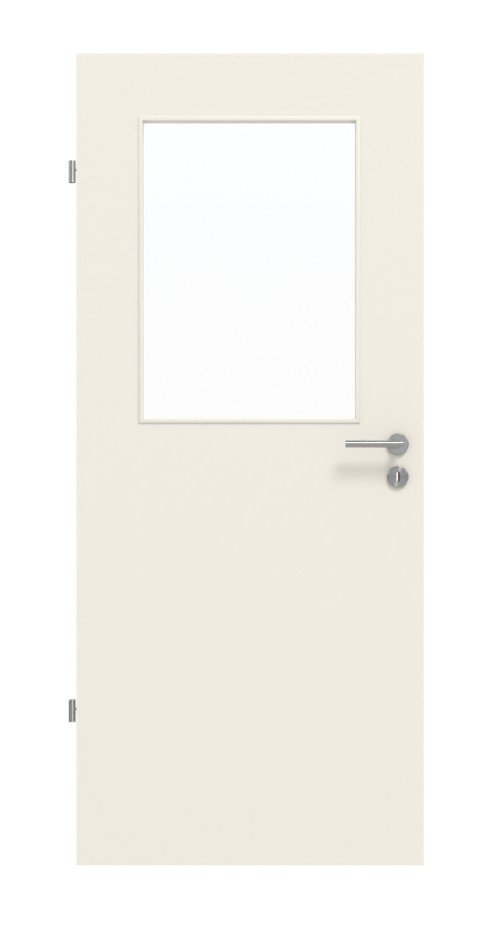 Wysokiej jakości wykonanie, gładkie skrzydło drzwiowe oraz prostokątowe okno z nałożonymi listwami szklanymi nadają wewnętrznym drzwiom niepowtarzalny, ponadczasowy charakter. Standardowo wykonane z przezroczystego szkła, możesz wybierać spośród wielu innych rodzajów szkła.