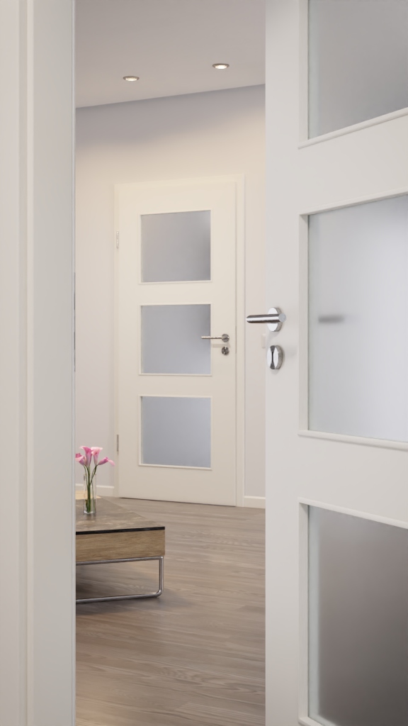 Atrakcyjny design kształtują przede wszystkim dwa elementy: proste, gładkie skrzydło drzwi oraz proste wypełnienia szklane z nałożonymi listwami.