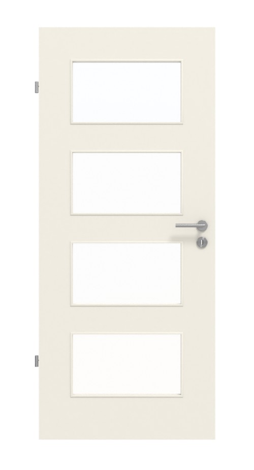 Atrakcyjny design kształtują przede wszystkim dwa elementy: proste, gładkie skrzydło drzwi oraz proste wypełnienia szklane z nałożonymi listwami.