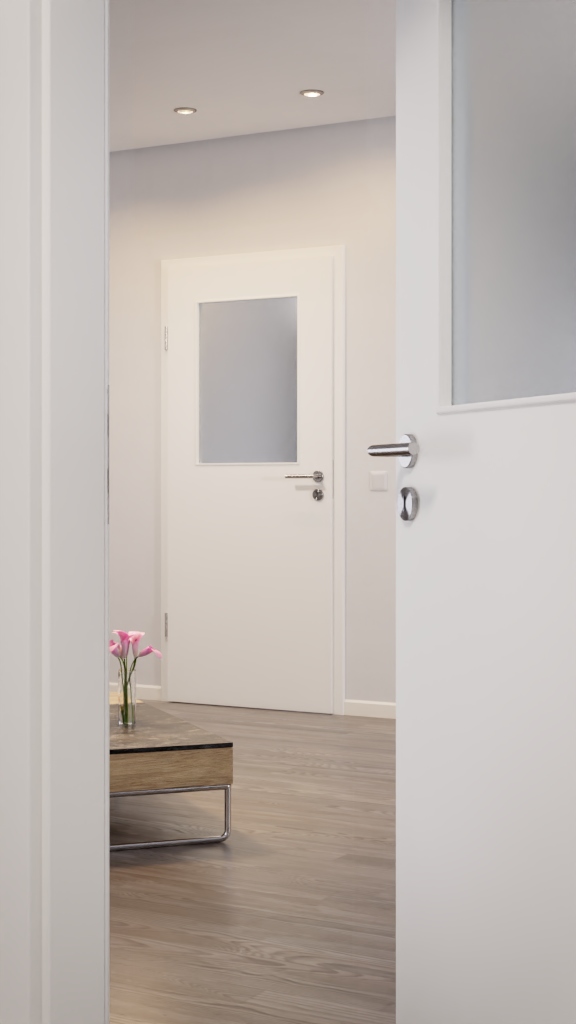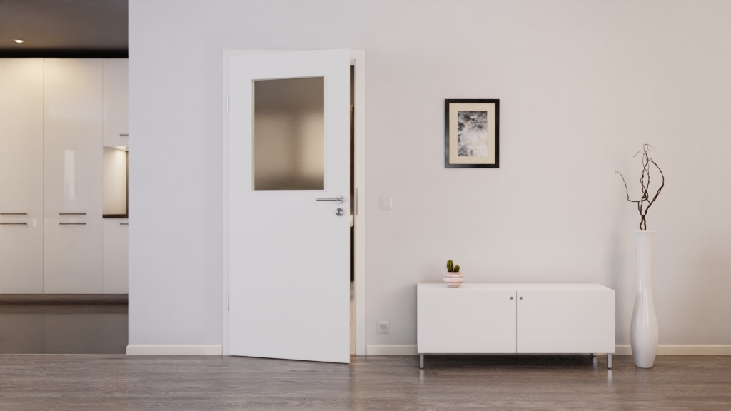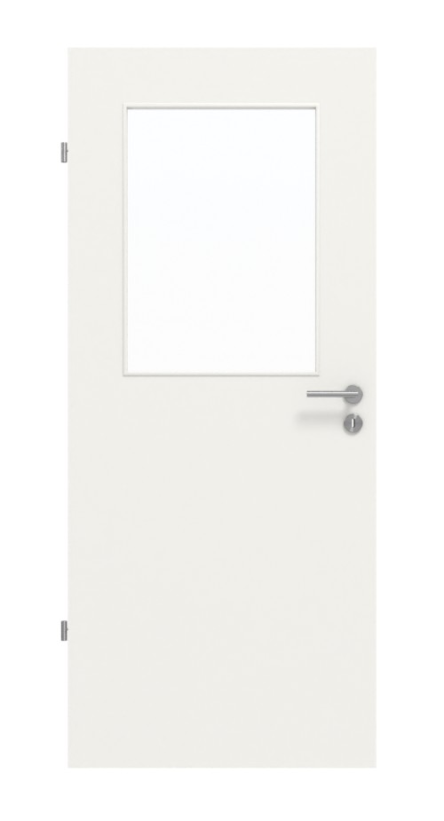 Solidny model z urokiem: Minimalistyczny design w postaci gładkiego skrzydła drzwiowego jest w tym drzwiach wewnętrznych od Lebo połączony z subtelnym wykończeniem w kolorze białym 9016. Całość dopełnia prostokątny przeszklenie. Stwórz przezroczyste przejścia między swoimi pomieszczeniami!