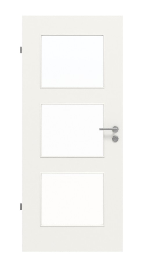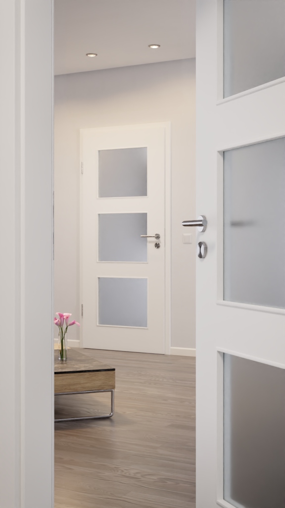 Prostota, która się opłaca: Minimalistyczny design w postaci gładkiego skrzydła drzwiowego łączy się w tych drzwiach wewnętrznych od Lebo z subtelną kolorystyką w bieli 9016. Do eleganckiego przeszklenia dostępnych jest wiele rodzajów szkła. Można wybierać między klasykami, takimi jak szkło przezroczyste czy szkło w stylu staroniemieckim, a nowoczesnymi wzorami, takimi jak Mastercarree czy satynowane.