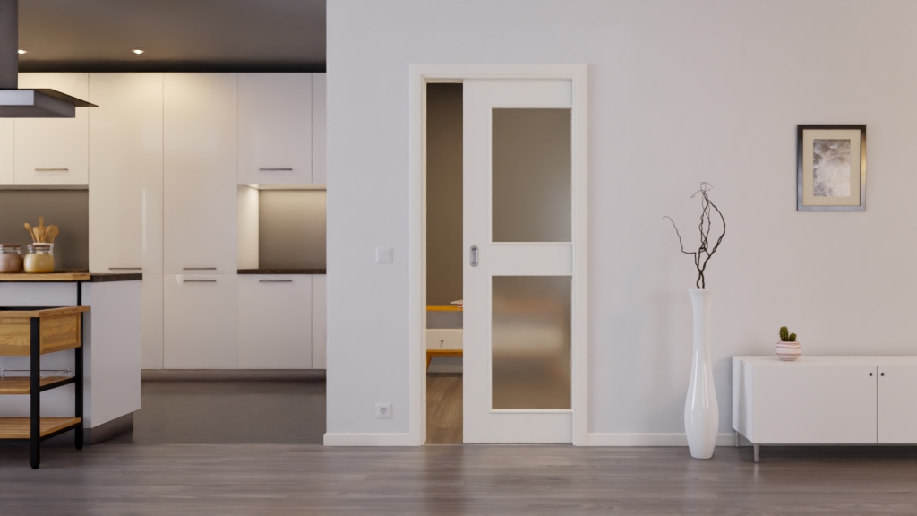 Jasne drzwi przesuwne ProLine w RAL 9010 z solidną płytą pełno-włóknistą: