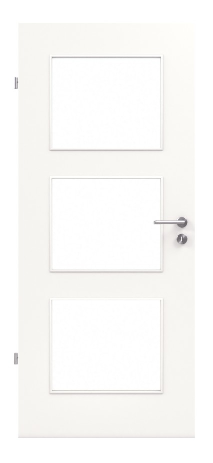 Gładkie skrzydło drzwi wygląda czysto i świeżo. Dzięki trzem prostokątnym przeszkleniom model tworzy jasną atmosferę. Skrzydło drzwi jest prawie w całości wypełnione przeszkleniami. Możliwe jest również wykonanie listew szklanych w wersji na równi z powierzchnią. Ponadto mają Państwo do wyboru wiele rodzajów szkła. Powierzchnia jest wielokrotnie lakierowana w klasycznym białym odcieniu RAL 9016. Dzięki temu otrzymują Państwo powierzchnię wysokiej jakości, którą można zobaczyć i poczuć.