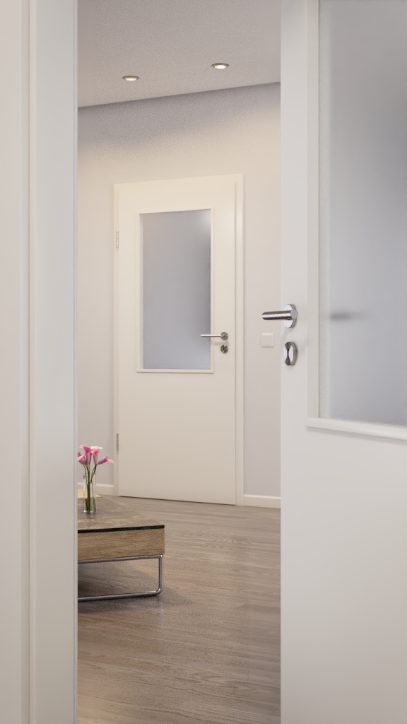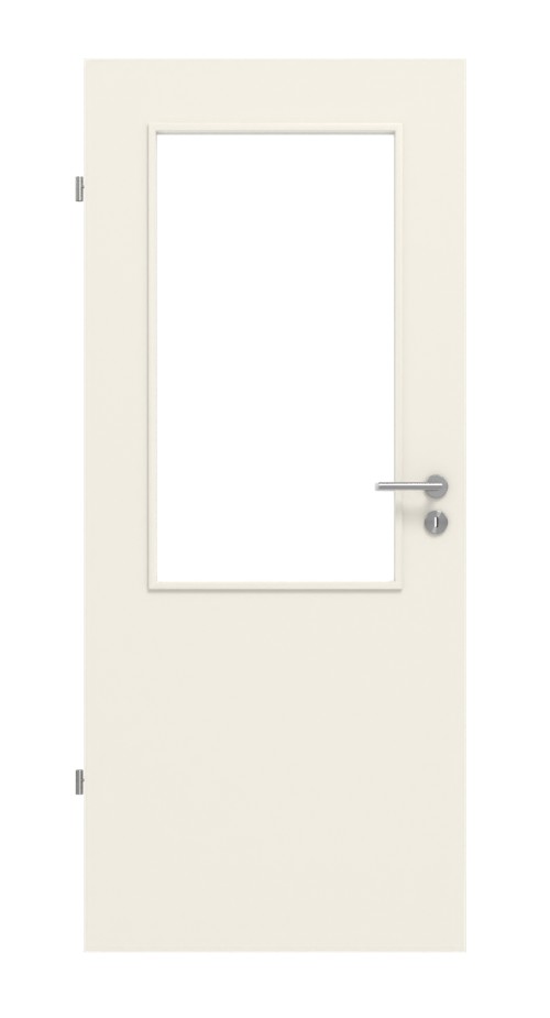 Przeszklenie optycznie dzieli drzwi na dwie części. Dzięki temu zapewnia częściowy wgląd do pomieszczenia, a dolna część chroni przed stłuczeniem szkła. Od przezroczystego szkła po matowe dostępne jest szkło odpowiadające (niemal) każdemu wyobrażeniu. Ten model drzwi dostarczany jest bez szklenia. Pożądany wkład szklany jest dostępny za dodatkową opłatą.