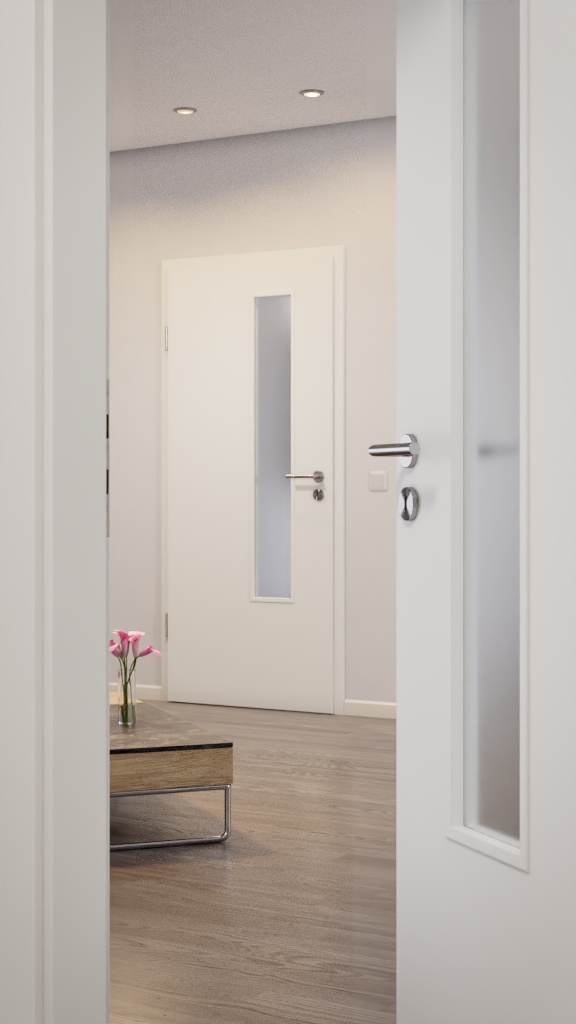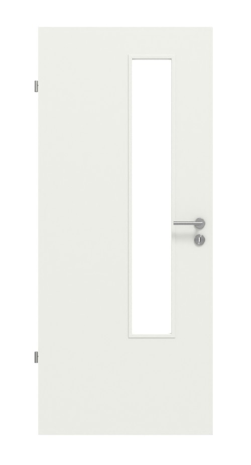 Dzięki białym powierzchniom powstaje nowoczesny design drzwi, który jest urozmaicony przez wąski przeszklenie. Możesz wybrać między szkłem przezroczystym a satynowym.