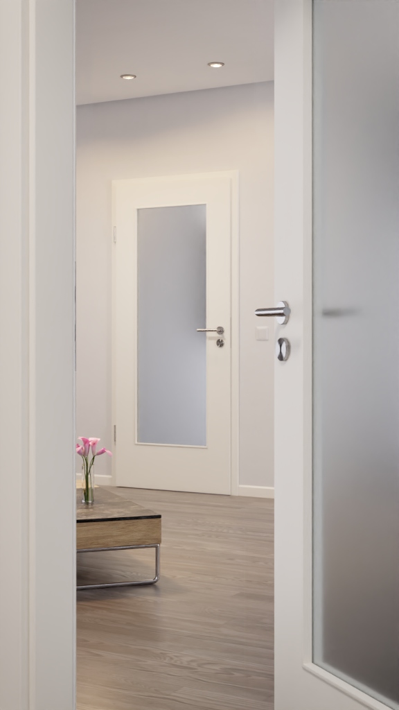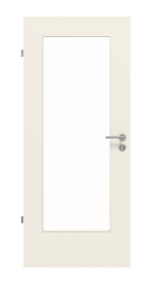 Powierzchnia lakierowana tych drzwi w sprawdzonym białym lakierze 9010 łatwo się czyści. Elegancki przeszklenie dodatkowo tworzy jasną i przyjazną atmosferę. W zależności od preferencji, mają Państwo możliwość wyposażenia go w klasyczne przezroczyste szkło lub interesującą wariację szklaną.
