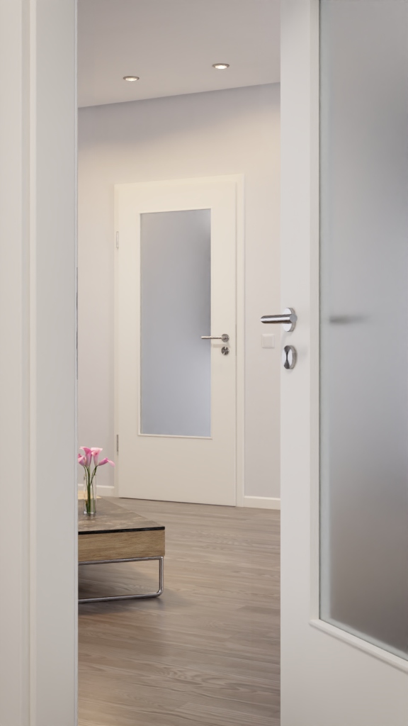 Wyposażone w lakierowaną powierzchnię w białym lakierze 9010, te drzwi szybko i łatwo się czyści. Dzięki przeszkleniu, które można wyposażyć w sprawdzone szkło przezroczyste lub modną wersję szklanej, uzyskuje się przytulną atmosferę.